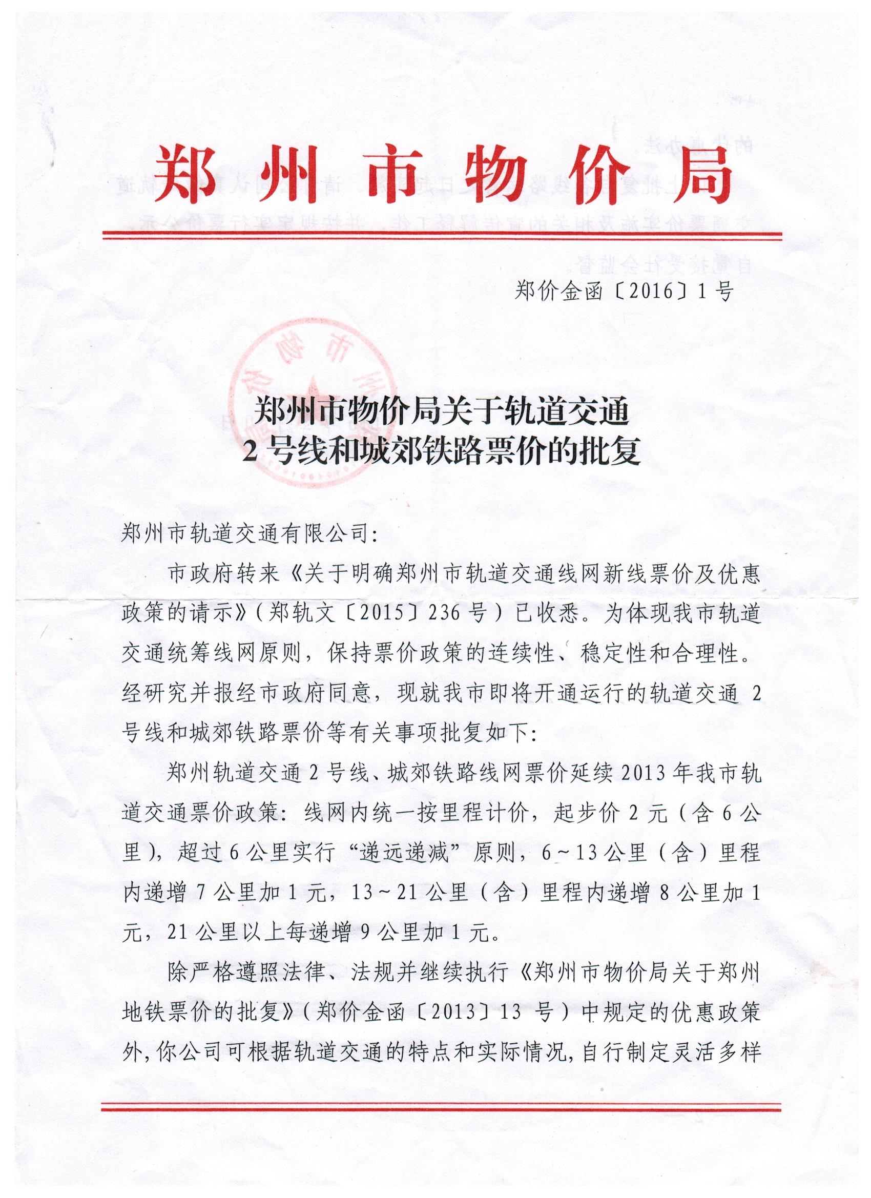 鄭州市物價(jià)局關(guān)于軌道交通2號線和城郊鐵路票價(jià)的批復(fù)